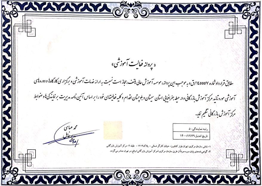 به اطلاع اعضای محترم هیئت علمی، دانشجویان، علاقهمندان و مراجع ذیربط میرساند که دانشگاه هاتف در تاریخ ۱۴۰۰/۱۲/۲۹ موفق به دریافت پروانه فعالیت آموزشی از مراجع قانونی و ذیصلاح گردید.